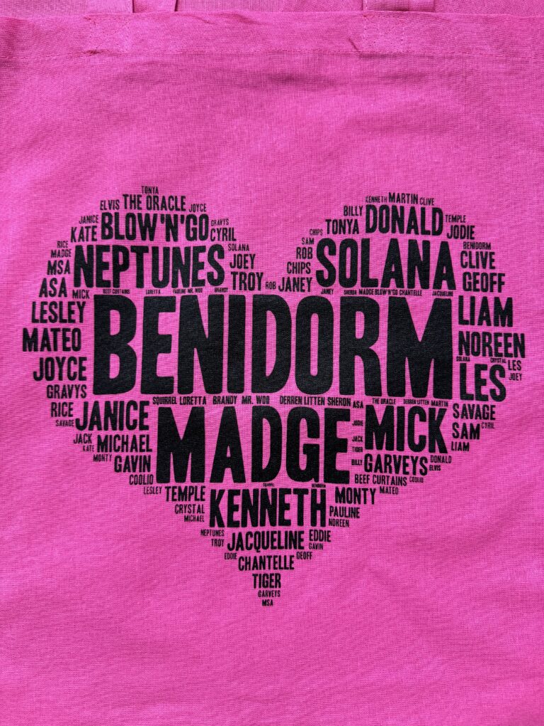 Benidorm fan tote bag in pink, as seen on TikTok.